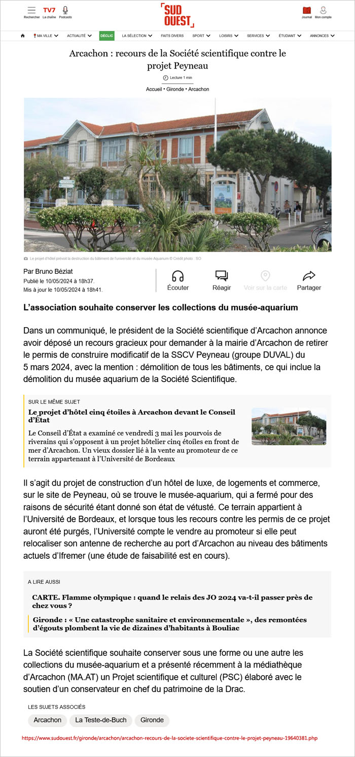 Dans un communiqué, le président de la Société scientifique d’Arcachon annonce avoir déposé un recours gracieux pour demander à la mairie d’Arcachon de retirer le permis de construire modificatif de la SSCV Peyneau (groupe DUVAL) du 5 mars 2024, avec la mention : démolition de tous les bâtiments, ce qui inclue la démolition du musée aquarium de la Société Scientifique. (…)