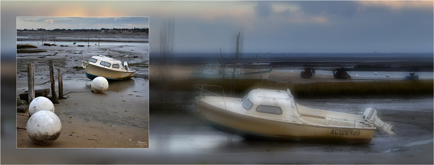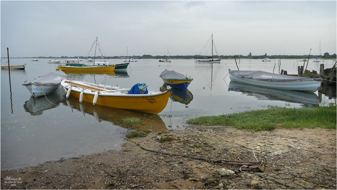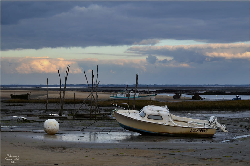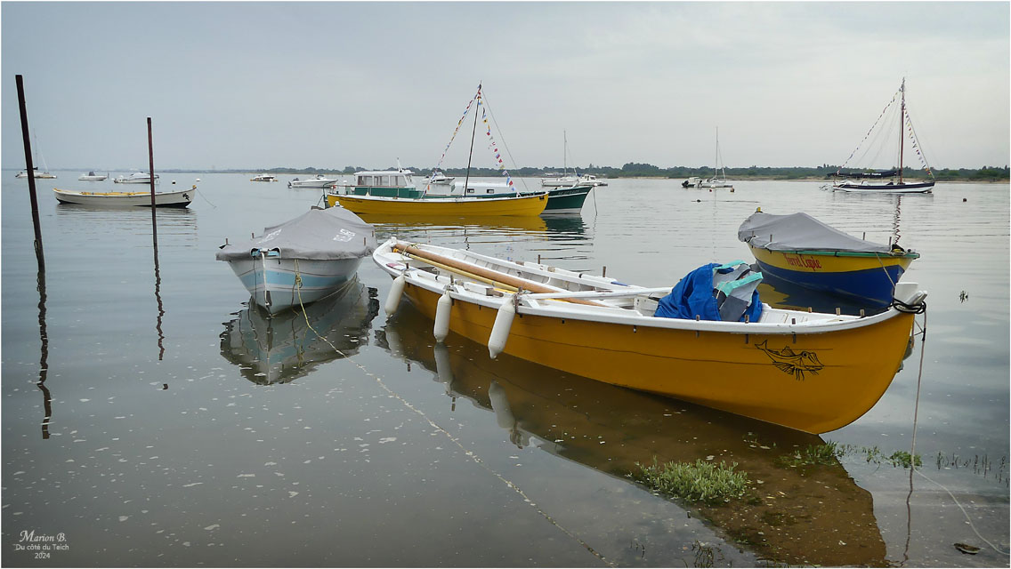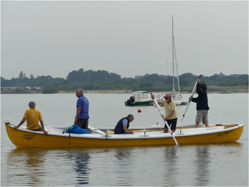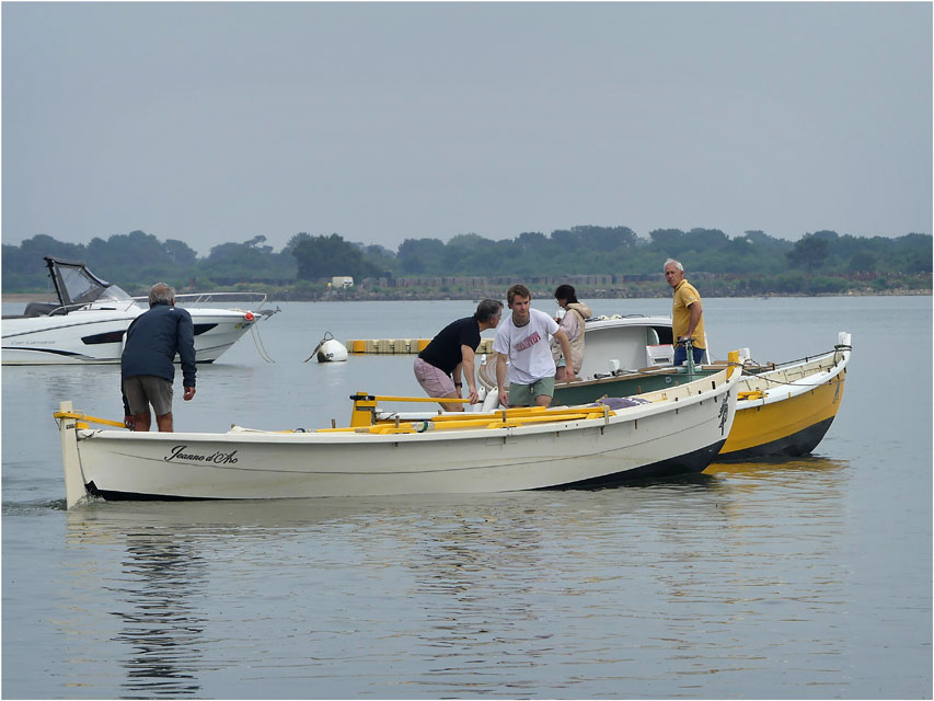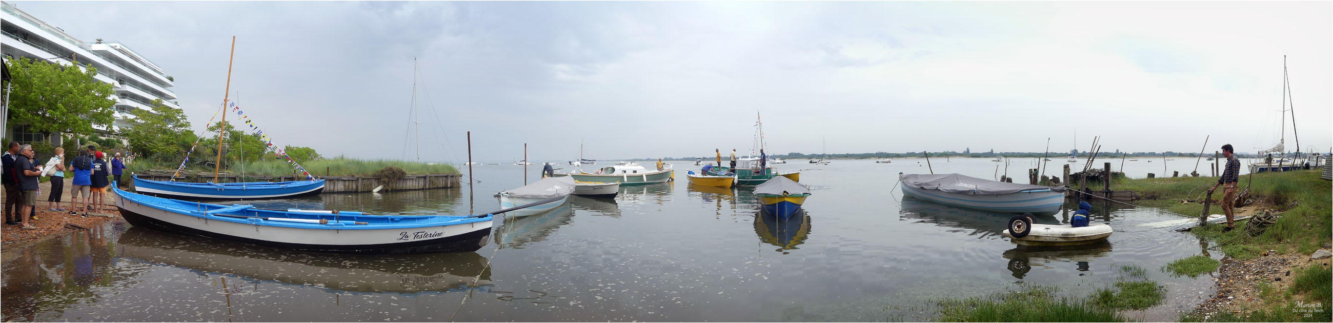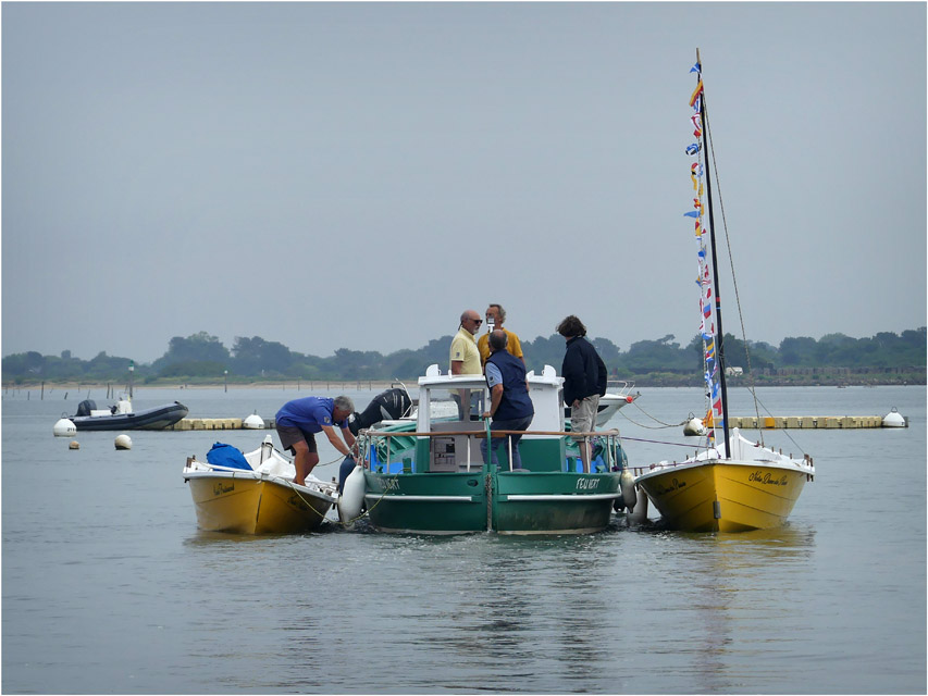 Vendredi 7 Juin en fin d’après-midi, vers la pointe de l’Aiguillon : pluie fine, grande douceur, eaux paisibles et armada de pinassottes venues assister à la bénédiction de l’Hippocampe, dernière née du chantier naval Bossuet.