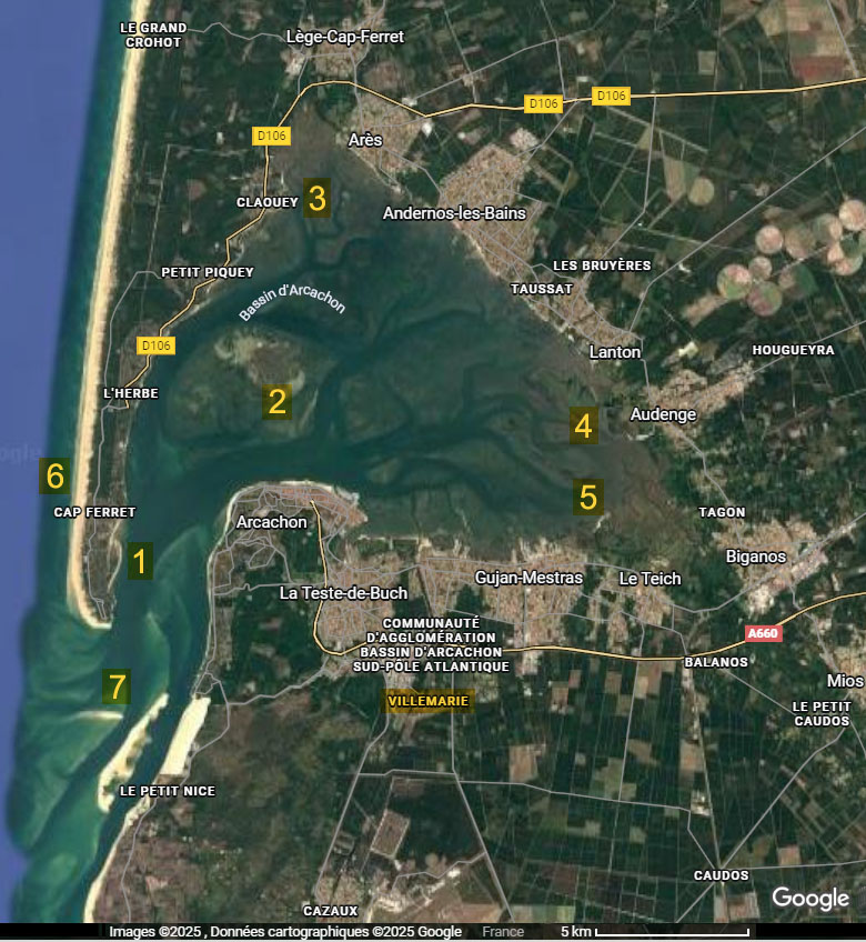 6 et 7 – Pointe du Cap-Ferret, passes, Bassin d’Arcachon, , bancs d’Arguin et du Toulinguet, dune du Pilat :
