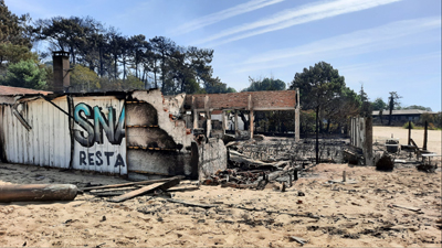 A Cazaux, après l’évacuation de 4000 personnes hier après-midi, les pompiers luttent sans relâche pour protéger les habitations. Trois maisons, quelques cabanes et un restaurant (« La petite playa ») ont été ont néanmoins été détruits, vers le port.