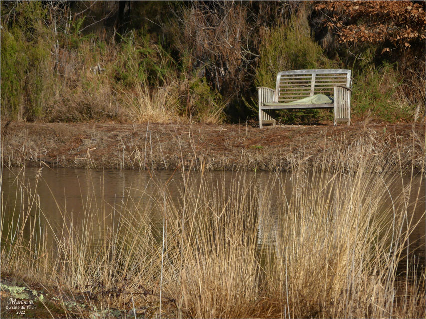 Balade de fin d’après-midi sur le sentier du littoral du Teich. Les roseaux en bordure de l’Eyre masquent la cabane de d’île Boucolle et je rebrousserai chemin avant d’atteindre les berges où sont amarrées quelques barques. De l’autre côté, sur la réserve ornithologique, des foulques défilent !