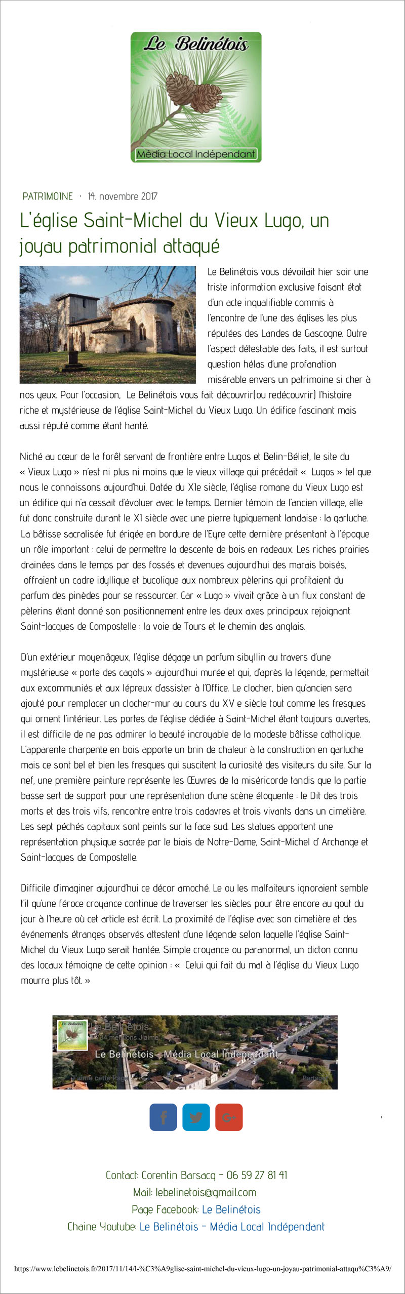 .Article Le Bétinois du 14 Novembre 2017 : l'église Saint-Michel du Vieux Lugo, un joyau patrimonial attaqué