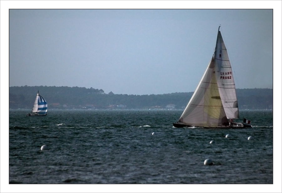 CP-DSC_7659-voilier blanc & spi bleu-blanc 6 février 2013 900 × 618 Arcachon, Abatilles, Péreire, le Moulleau