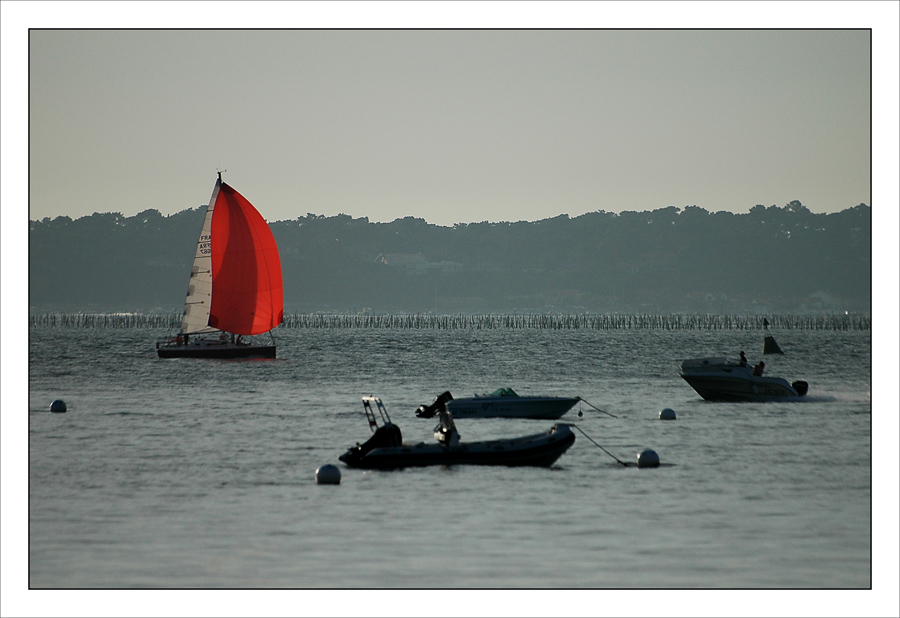 CP-DSC_7677-voilier spi rouge & hors-bord 6 février 2013 900 × 618 Arcachon, Abatilles, Péreire, le Moulleau