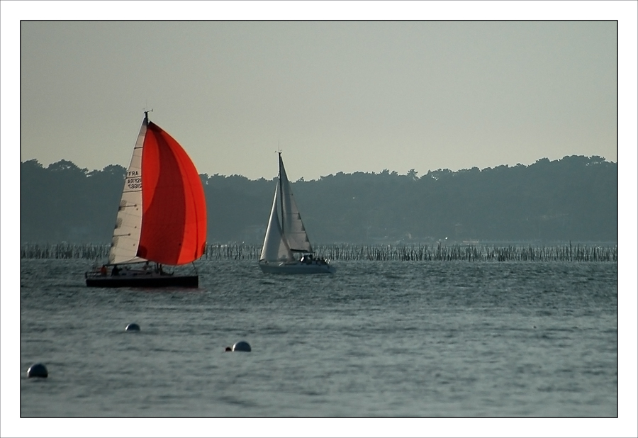 CP-DSC_7678-spi rouge & voilier blanc 6 février 2013 900 × 618 Arcachon, Abatilles, Péreire, le Moulleau