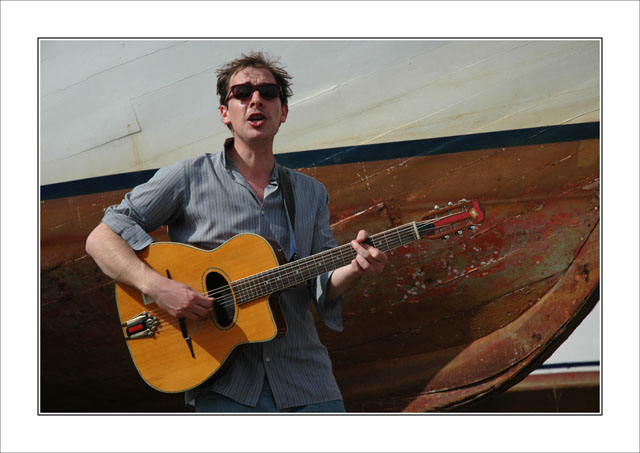 Sur le port de Meyran-Ouest, devant le chantier naval Debord, hier après-midi. trois des quatre musiciens du groupe Picotte, au répertoire varié… mon coup de coeur du jour !!