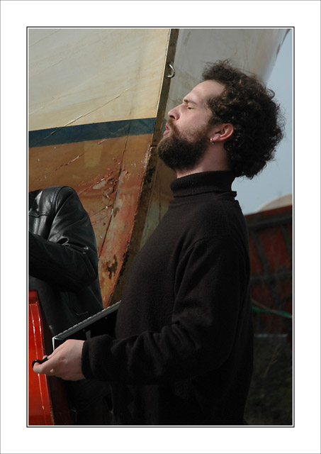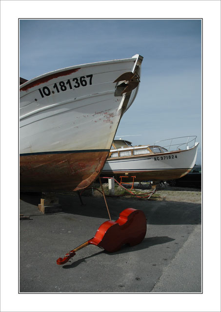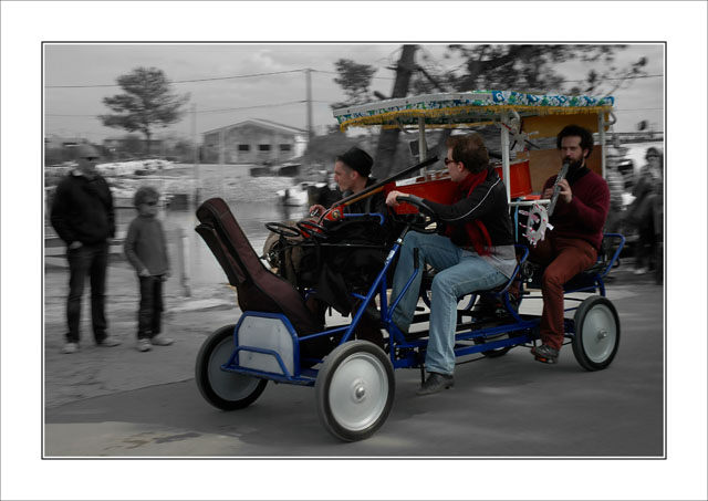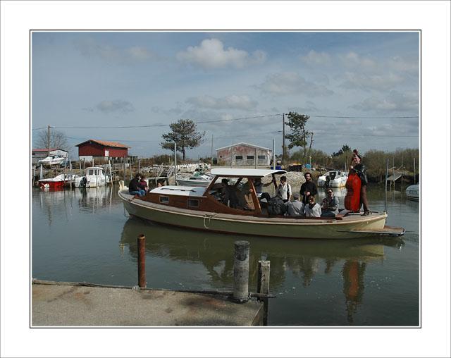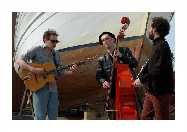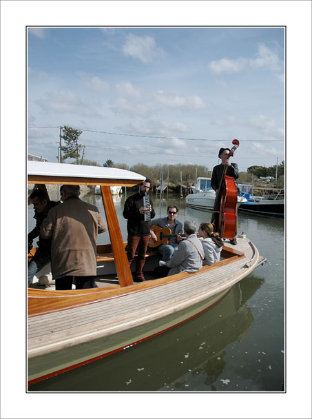 Sur le port de Meyran-Ouest, devant le chantier naval Debord, hier après-midi. trois des quatre musiciens du groupe Picotte, au répertoire varié… mon coup de coeur du jour !!