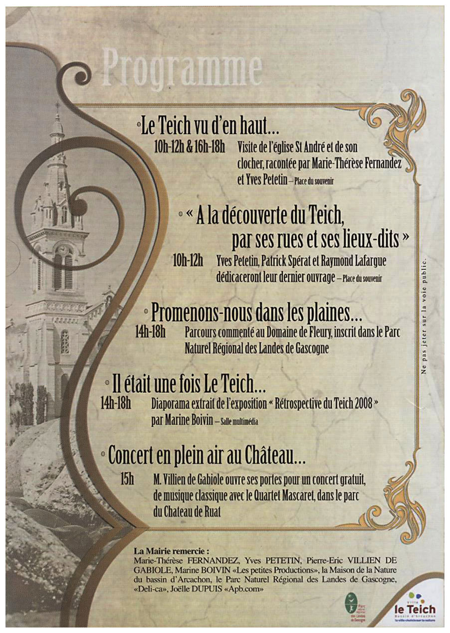 Ayant en 2009 monté quatre à quatre les marches du clocher (si si… !), visité le mois dernier l’église St André pour l’année jacquaire, vu à plusieurs reprises les expositions de Marine Boivin, fait cet été lors de la fête à Léo la balade guidée à la fontaine St Jean, trouvé le ciel trop bleu pour s’enfermer dans la salle multimédia du parc ornithologique, j’ai cette année déserté le Teich et sa journée du Patrimoine !