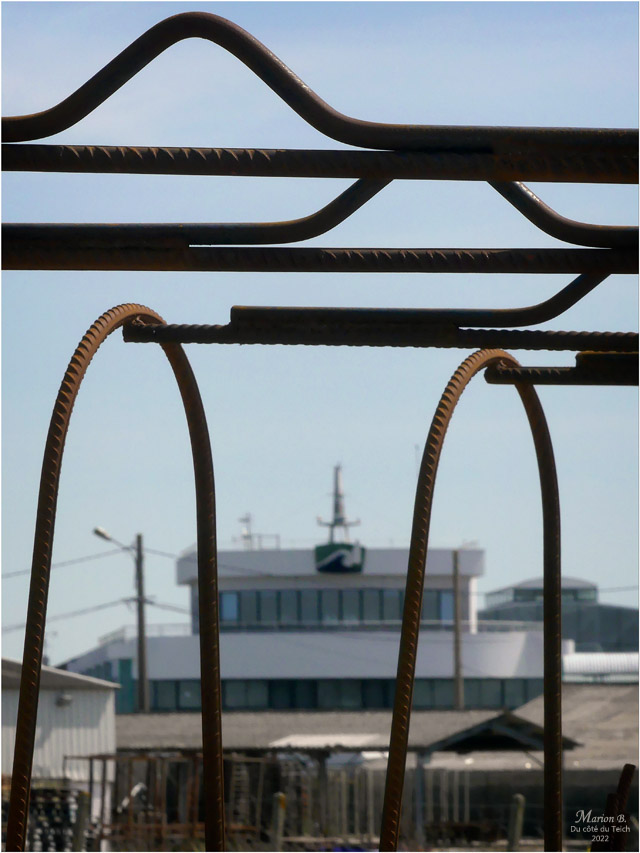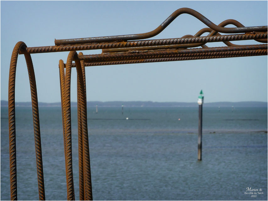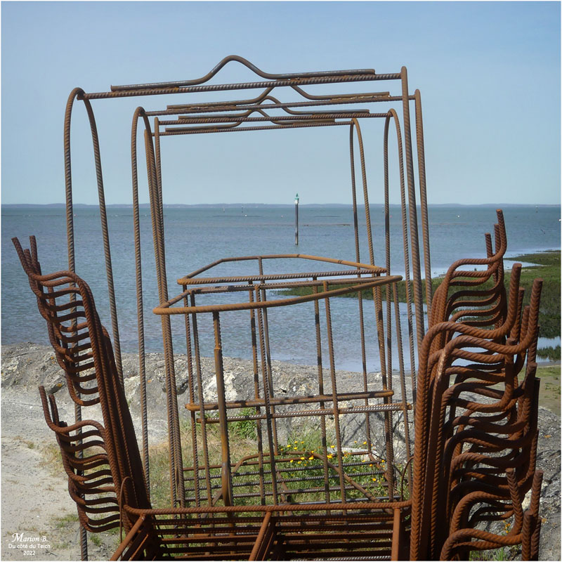 Pour les lecteurs de passage sur le blog et dans la région, pas forcément amateurs d’huîtres et intéressés par leur « élevage », je précise simplement que les diverses « cages » en ferraille sont destinées à réunir et acheminer les collecteurs de naissains (coupelles, tubes, tuiles chaulées) sur les parcs. Les tables accueillent les poches durant la croissance des jeunes huîtres. (en savoir un peu +)