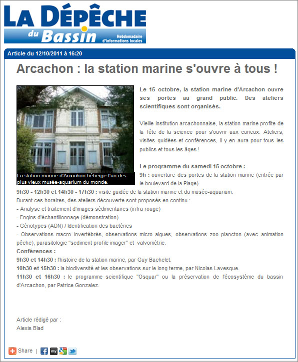 Par ailleurs, le samedi 15 Octobre 2011, la station marine et le Musée-Aquarium nous ouvrent leurs portes.