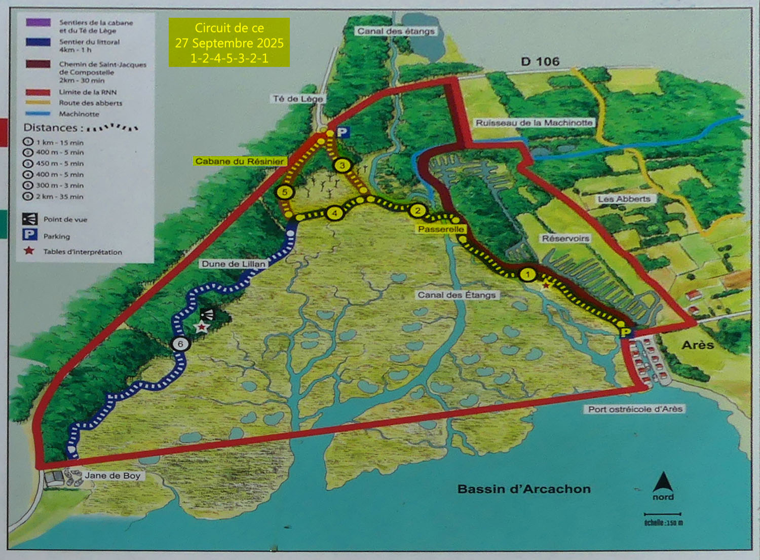 Par manque de temps, nous irons seulement à la cabane du résinier, au nord de la réserve et à mi-parcours. Petite randonnée d’environ 4,5 km, facile et agréable. (voir carte ci-dessous)