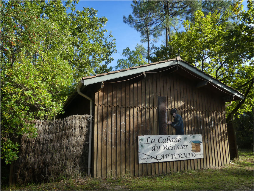 On entre dans une zone boisée autour de la cabane du résinier de l’association Cap termer (repère 5) :
